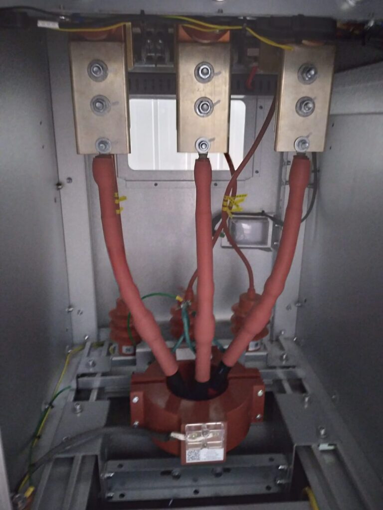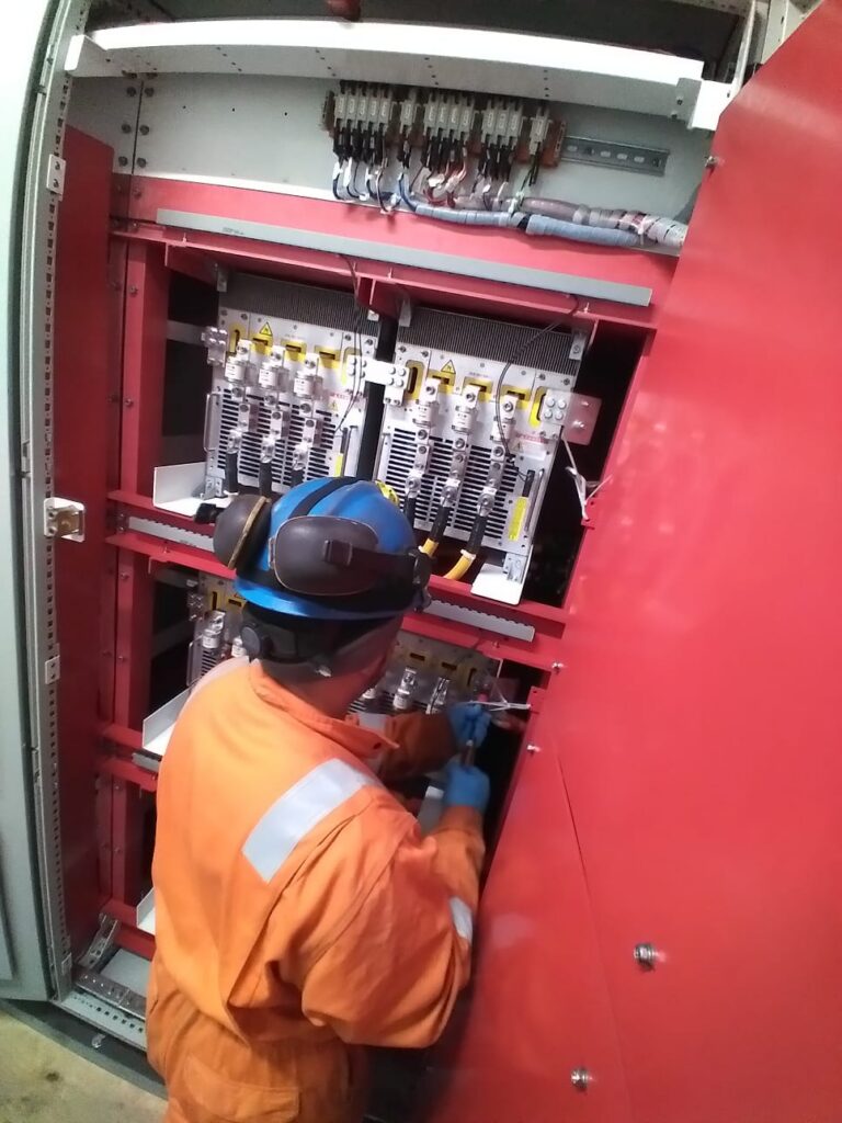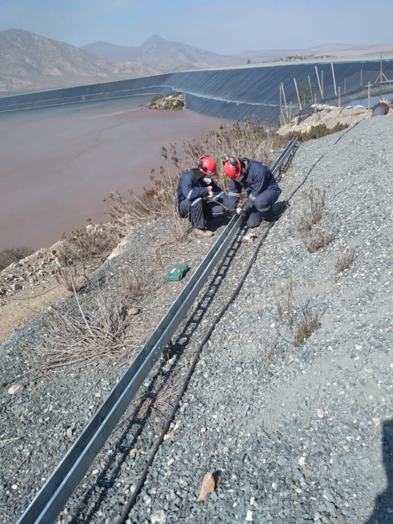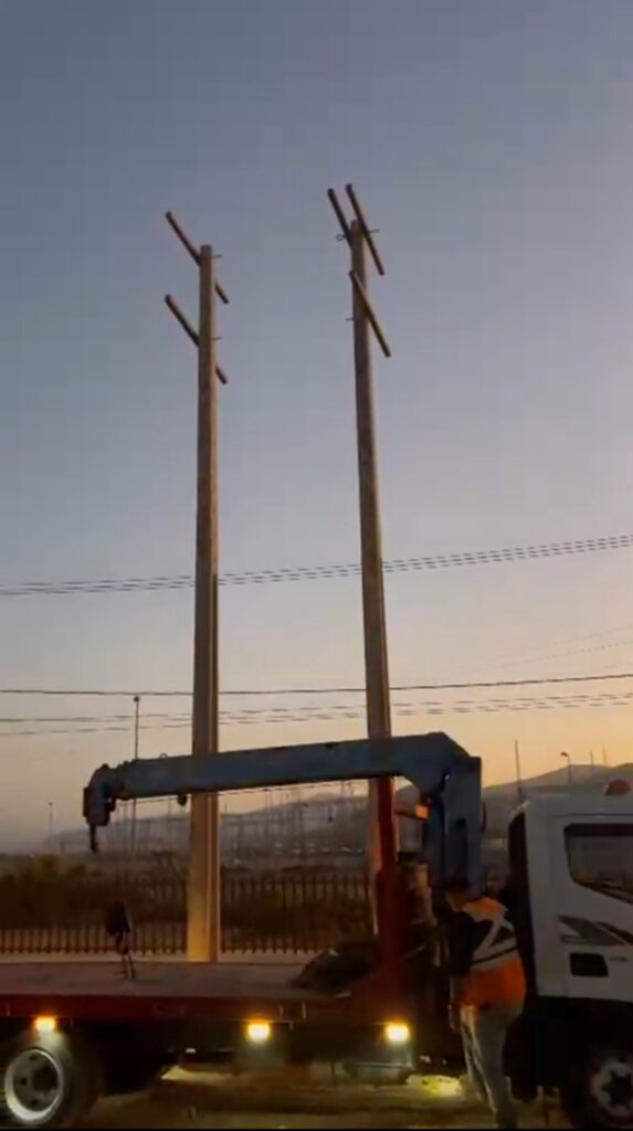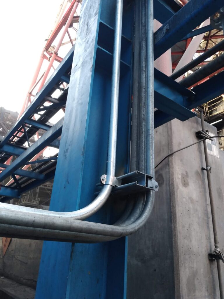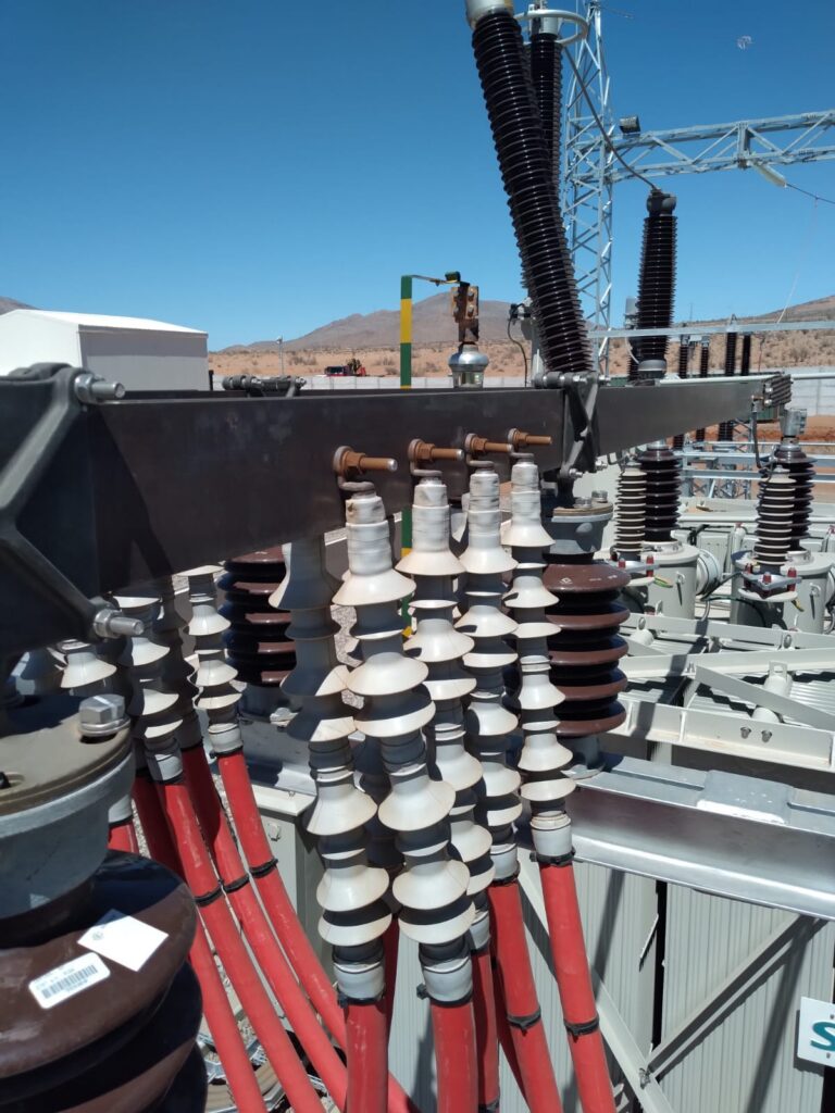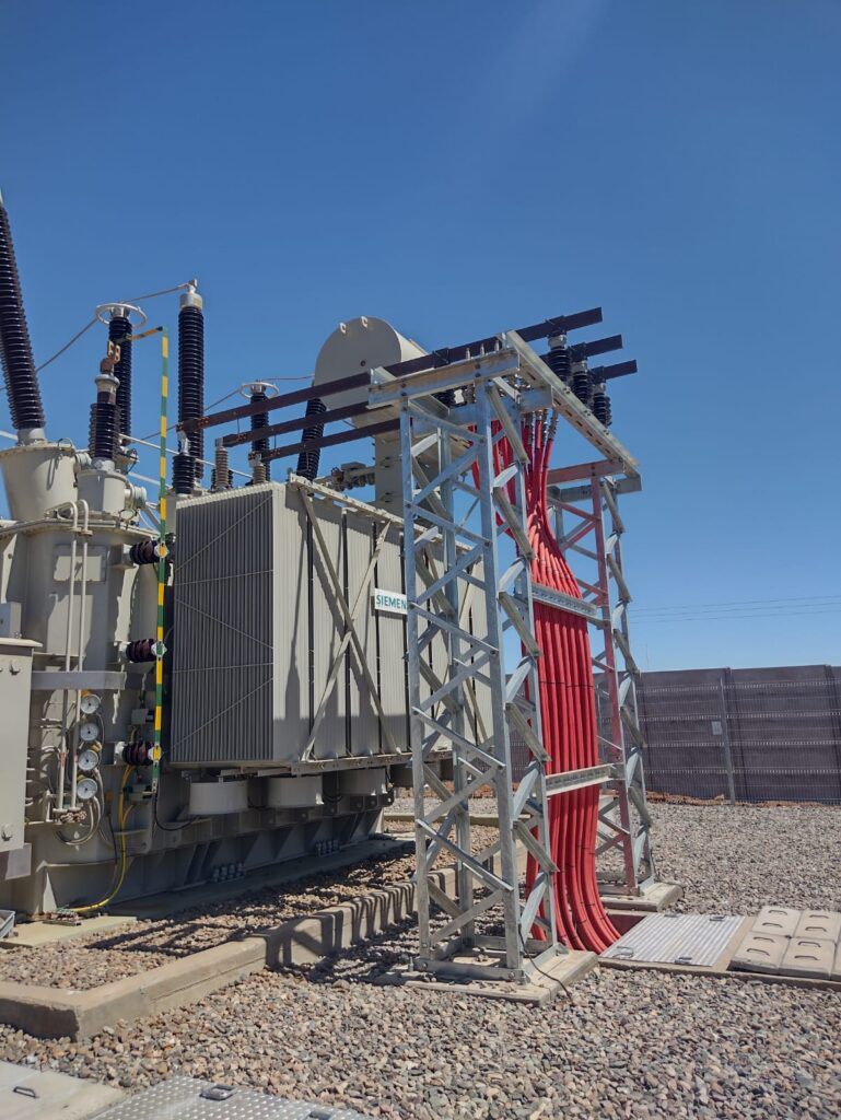 Técnicos ejecutan el montaje de escalerillas porta cables para tendido electrico,realizando ajustes estructurales en terreno bajo protocolos de seguridad para entornos rurales.